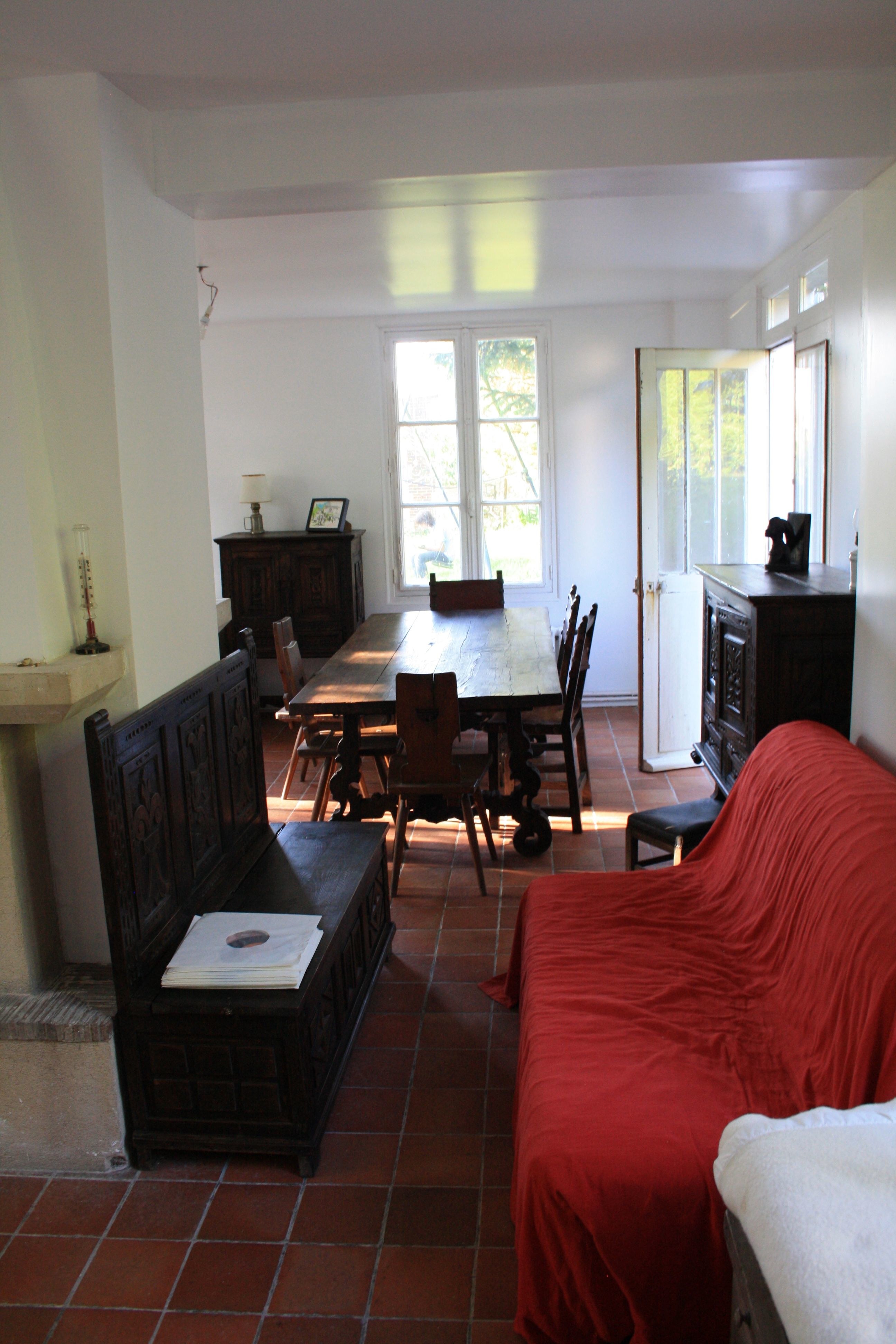A l'intérieur, au rez-de-chaussée, on trouve une grande cuisine, dans laquelle on peut manger à plus de dix, un salle de baby-foot, un bureau et un vaste salon équipé d'une cheminée située au milieu de la pièce.